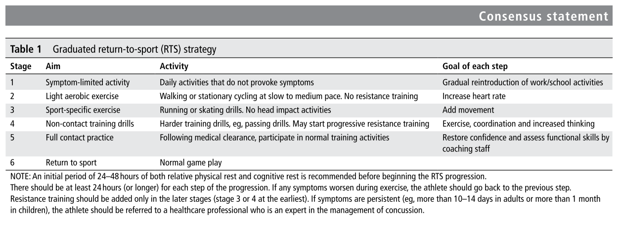 You may continue to see the “Old sport Concussion RTP” continue to be used as each organization will need to go through a process to update the RTP that they use. For High Schools the regulating organization is the State High School Leagues, College is NCAA, and professional organizations such as the NFL, and NBA regulate themselves. These changes will take some time unfortunately. But most original concussion protocols have these 6 main stages in common.